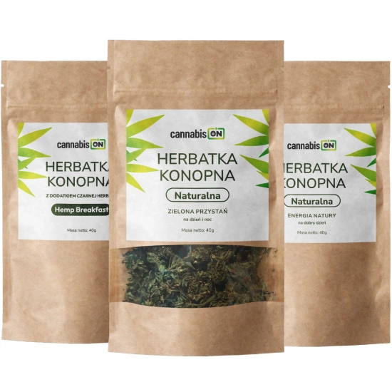 - Kompletny zestaw herbat konopnych CBD i CBG, zaprojektowany z myślą o naturalnym rytmie dnia. Trzy różne herbaty, dopasowane do poranka, aktywnego dnia i spokojnego wieczoru – bez konieczności wyboru pojedynczych wariantów.